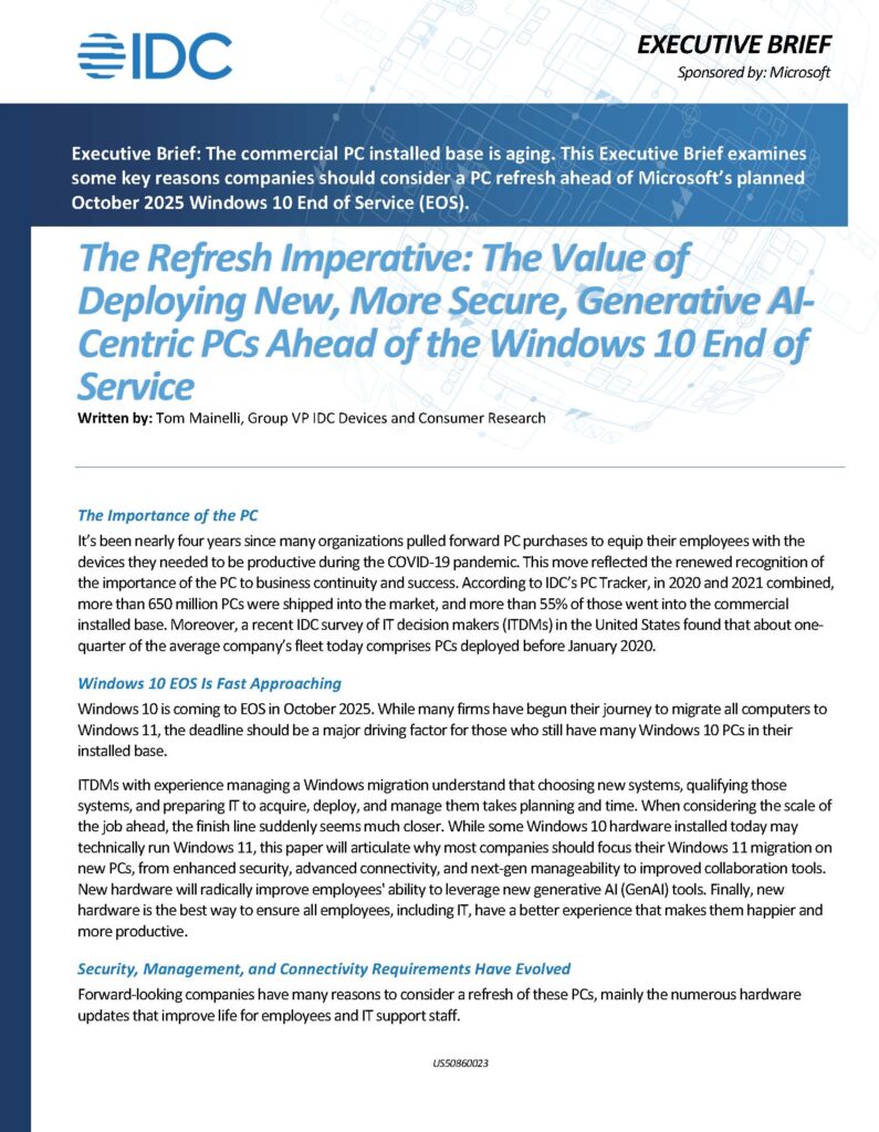 The Refresh Imperative: The Value of Deploying New, More Secure, Generative AI Centric PCs Ahead of the Windows 10 End of Service. IDC Research. 2023. LINK